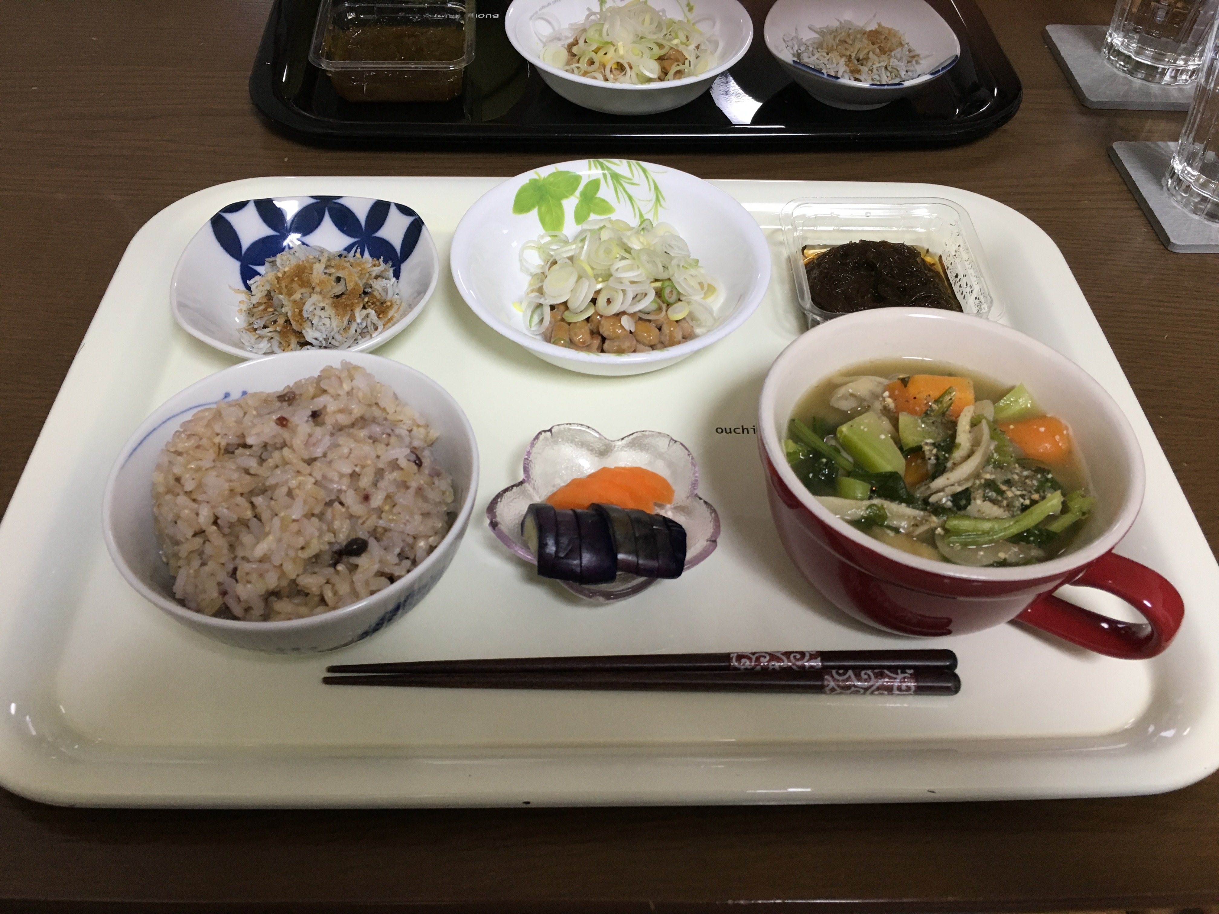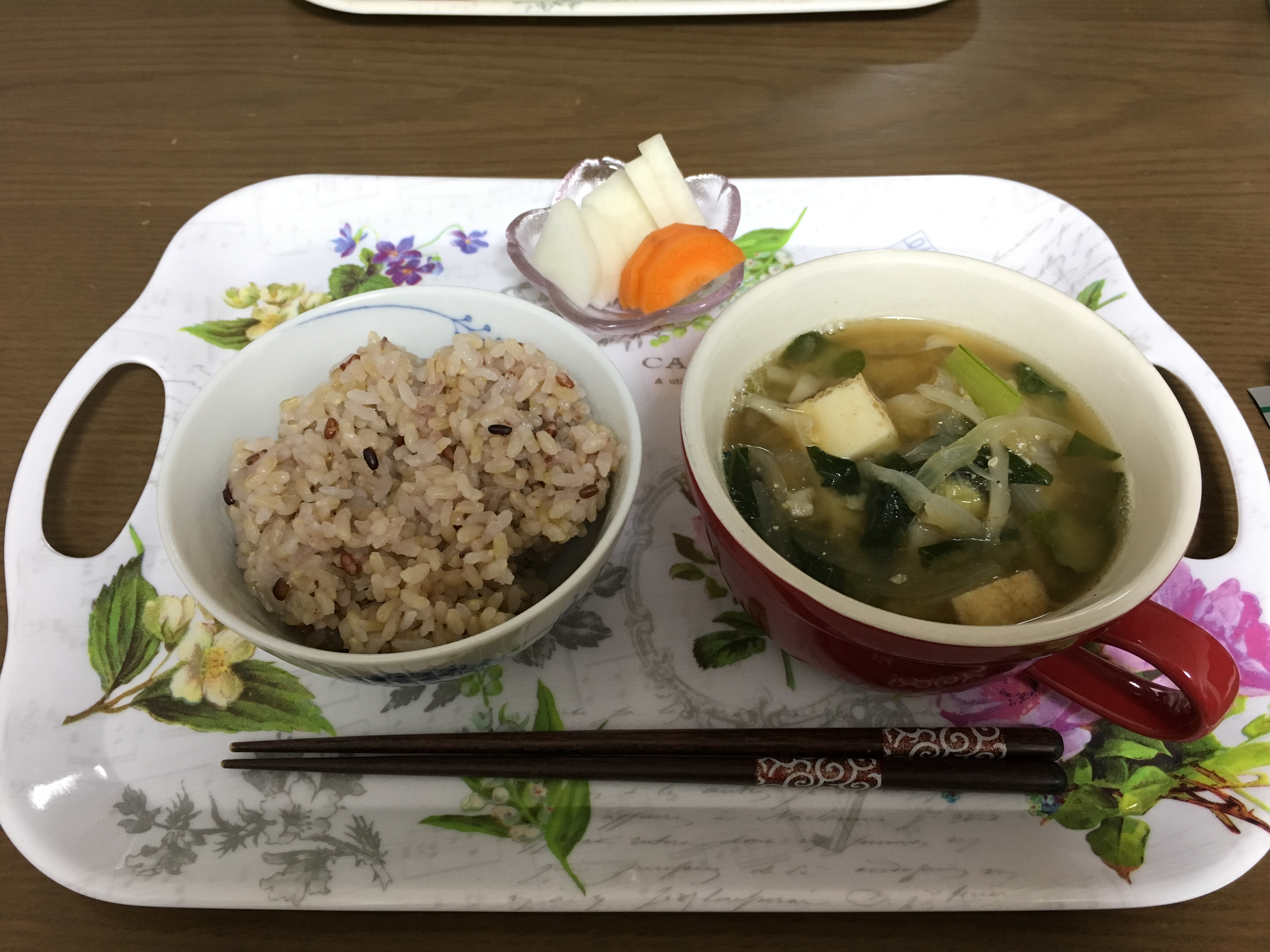 旬の野菜と厚揚げなどてきとうに組み合わせた具だくさんのみそ汁を炊いて、その時の旬の野菜をてきとうに漬けたぬか漬けを添えます。あとは卵を焼くか魚を焼くか、朝なら納豆にめかぶなどそのまま食べられるものを出したりもします。