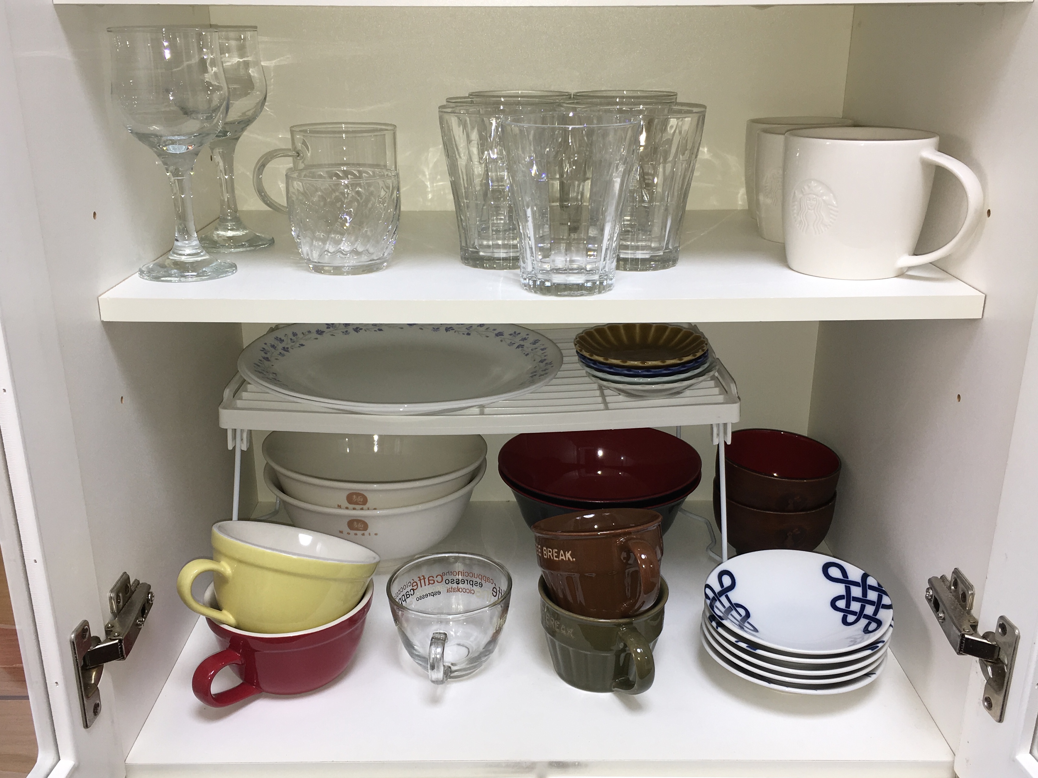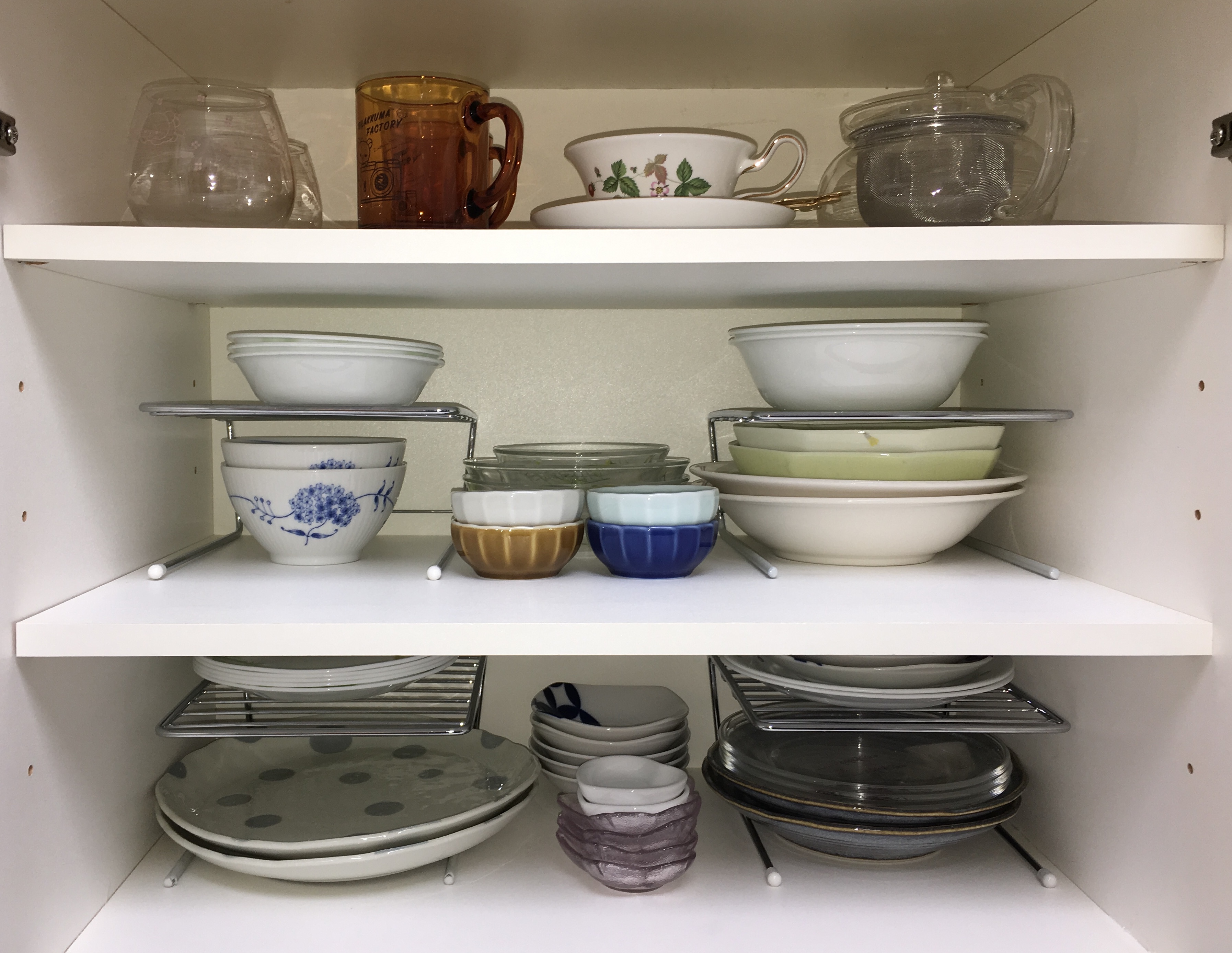 そして、その奥には重たいどんぶりやでかいお椀、超大皿や豆皿等を収納しています。百円ショップの棚を活用して、上下にスペースを増やして置いています。どんぶりや超大皿は一年で10回位しか使わないレア使用なので、奥の方にひっそりと待機させています。