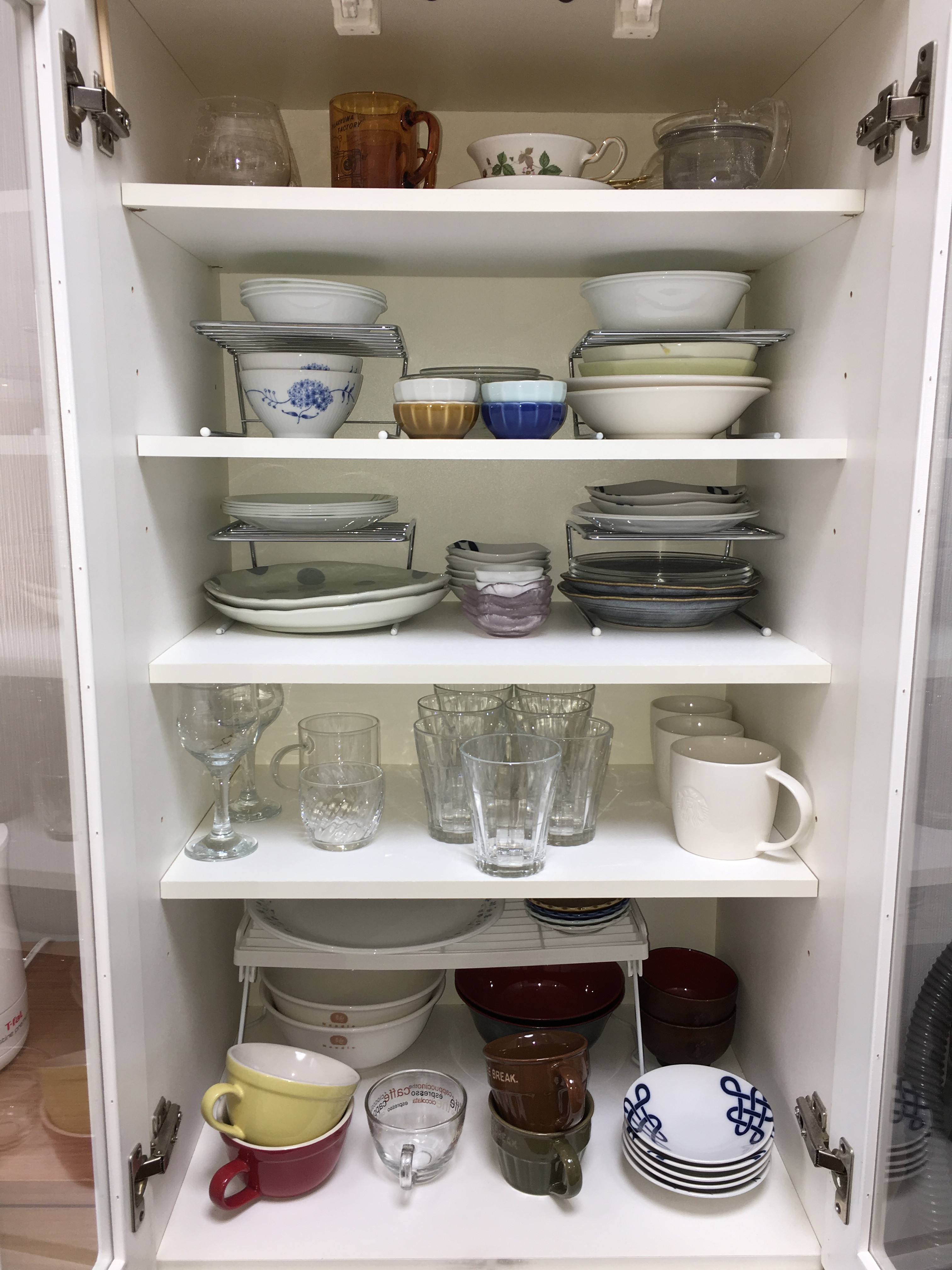 上から二段目は茶わんやお鉢類等少し深さがある食器を置いています。ニトリで買った小さい食器ラックを活用して、上下にお鉢を置ける様にプチ工夫をしています。