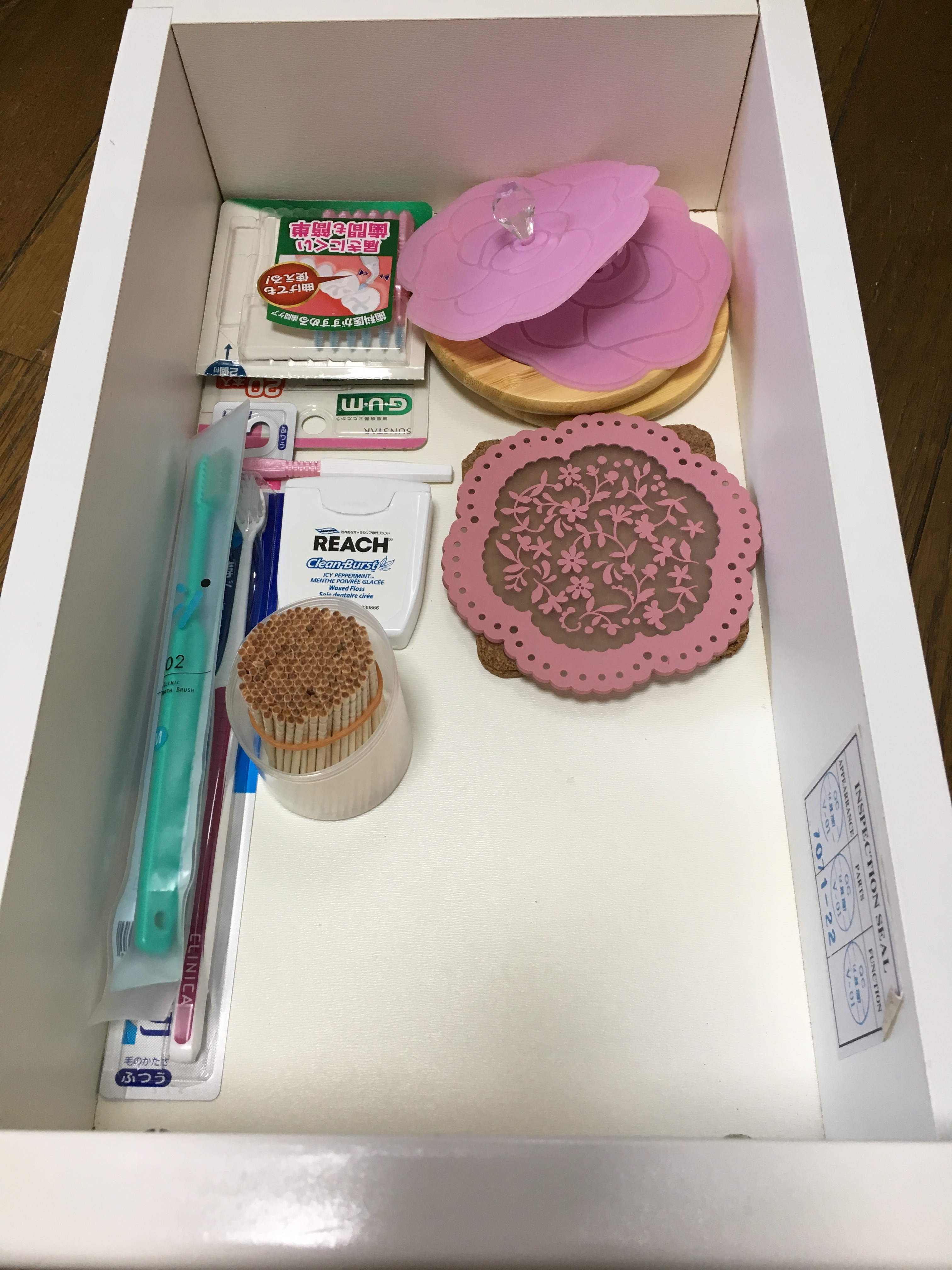 ダイニングテーブルで使うコースター・カップのシリコン蓋に、歯ブラシのストック・歯間ブラシ・フロス・つまようじを収納しています。