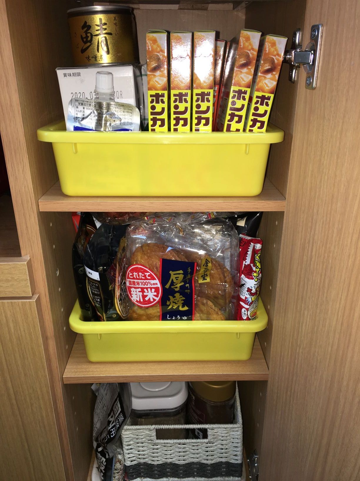 真ん中の段には、おせんべいやスナック菓子等夫の好きなおやつをしまっています。基本的には未開封の物しか入れないようにしていて、開封済みの物とごっちゃに混ざらない様に気を付けています。