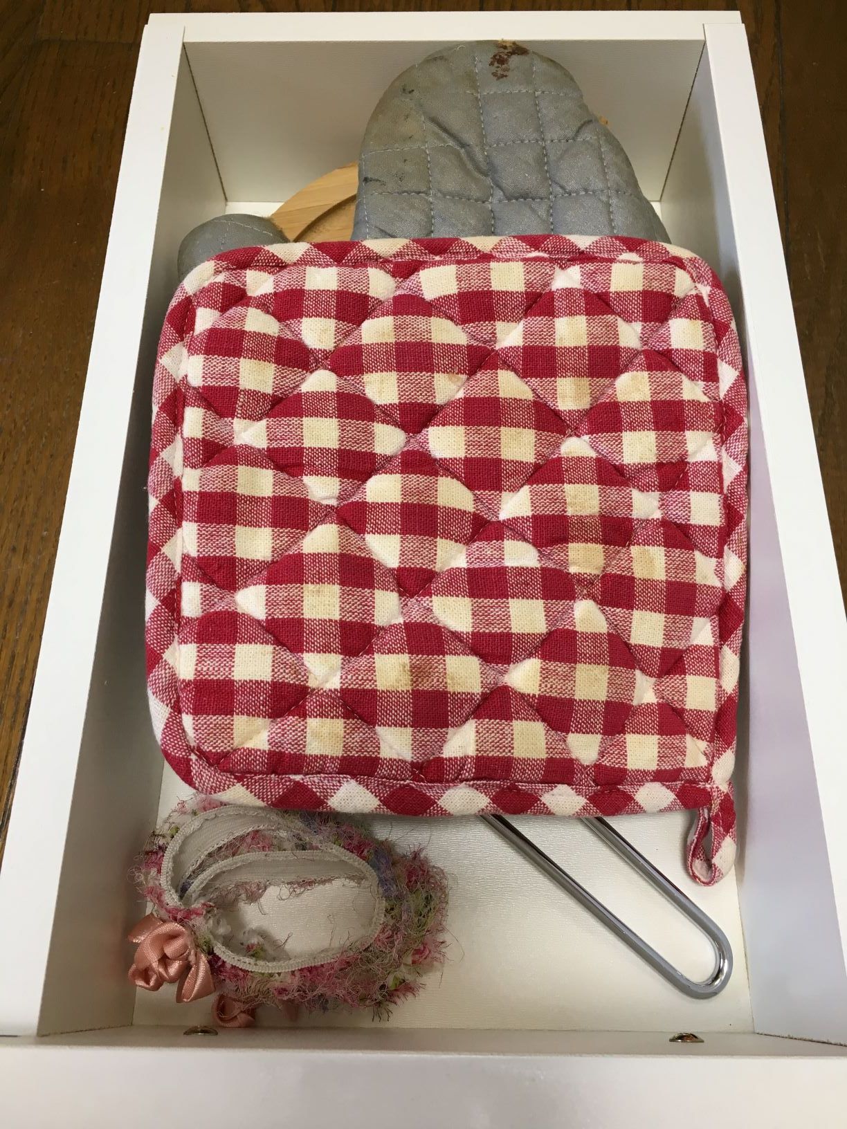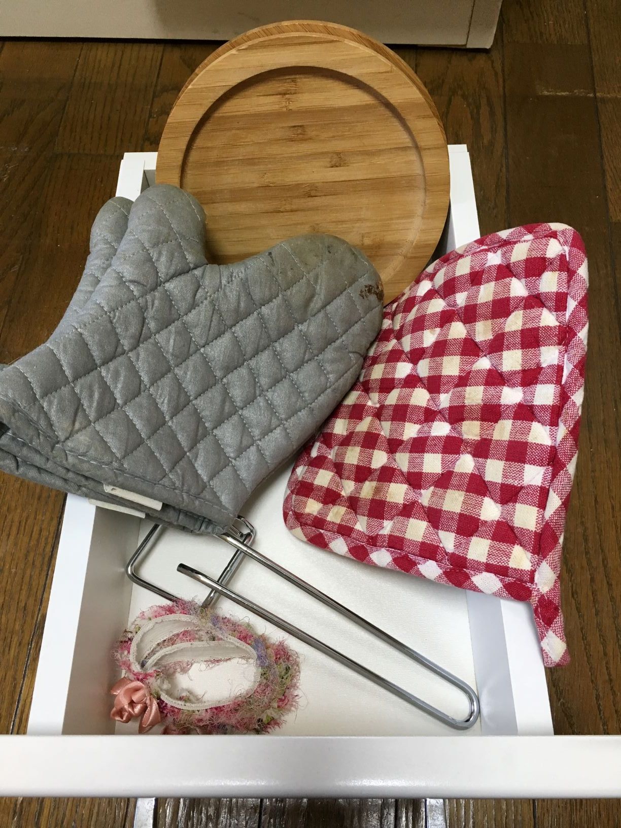 木の鍋敷き×2・布の鍋敷き・ミトン・オーブン(トースター)の天板の取っ手・アームバンド(袖まくるゴム)を収納しています。