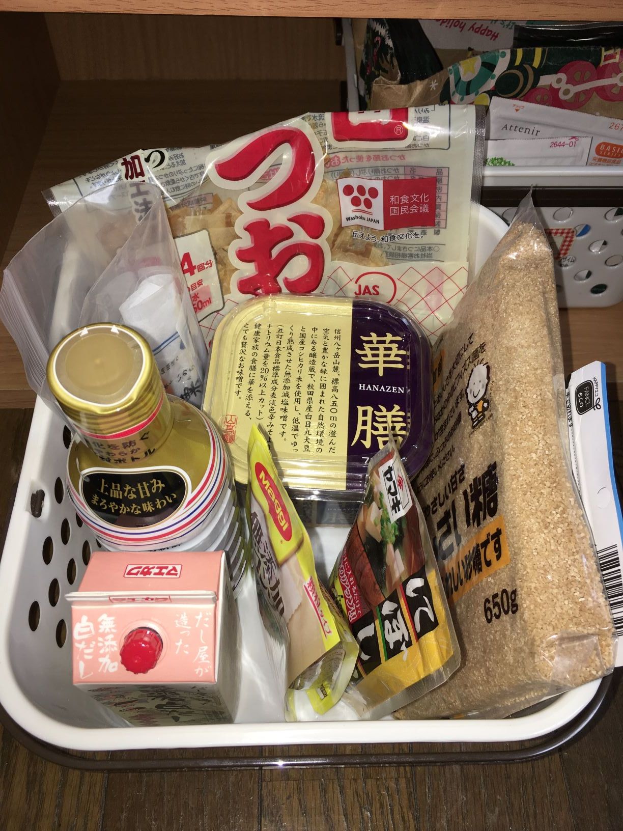下段左側のカゴには、常温保存でOKの調味料ストックを収納しています。基本的に未開封の物をしまっていますが、詰め替えの調味料(塩等)はチャック付袋に入れて一緒にしまうこともあります。このカゴの中に納まる様に買う量を調整することで、買い過ぎない様に在庫をセーブできています。