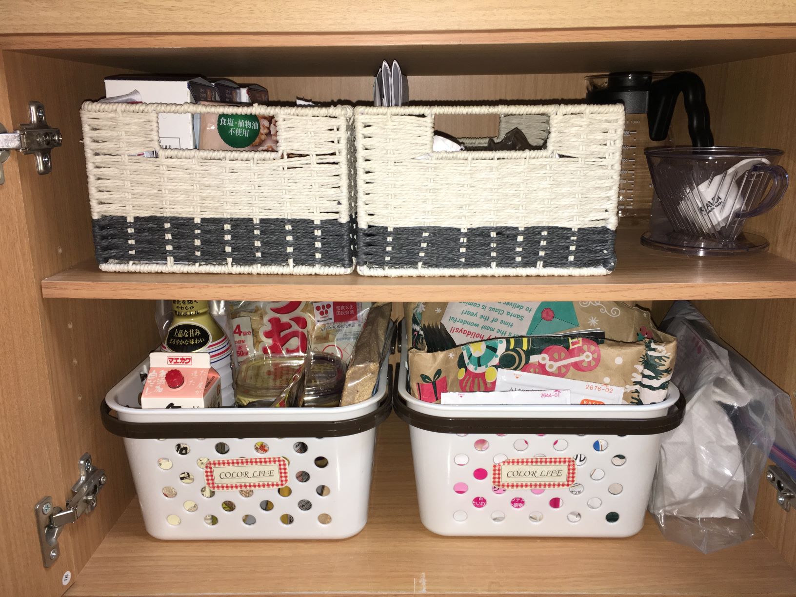 上下段ともにカゴの右サイドにコーヒーのドリッパーとサーバー、漢方の煎じ薬を滑り込ませるようにしまっています。