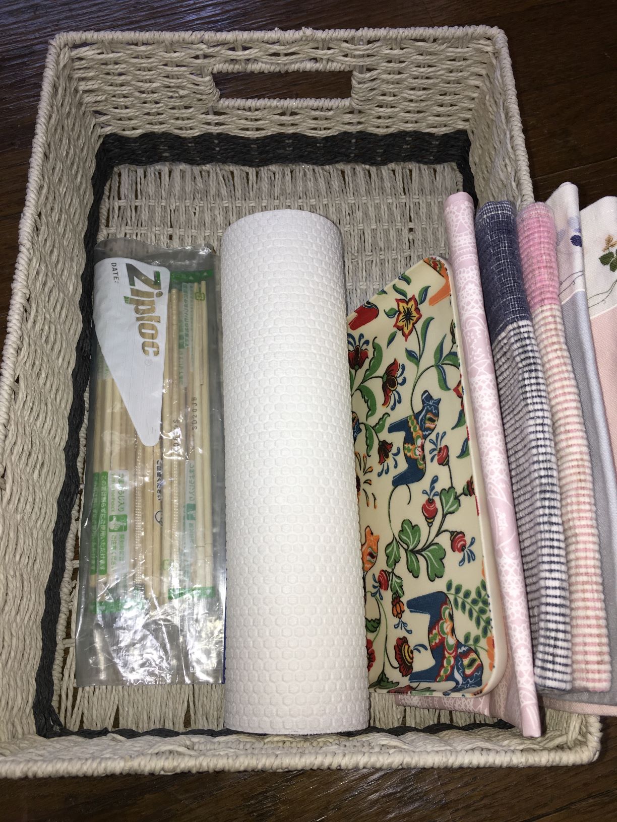 手前の右側には洗濯済の清潔なふきんをカゴにしまい、左側には何かと便利なキッチンポリ袋のボックスを置いています。