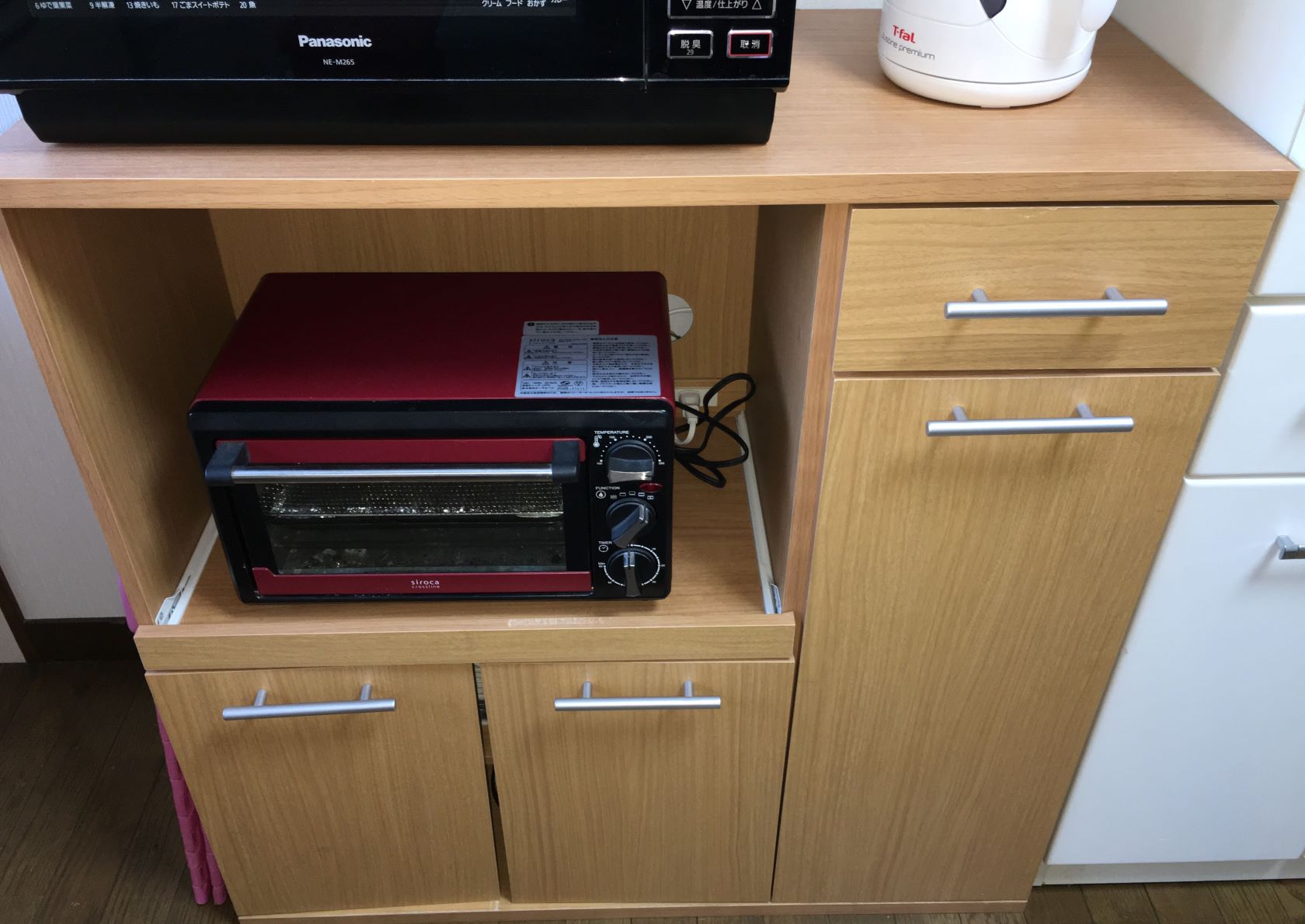 オーブンレンジや湯沸かしポットなどが置いてある棚にも、物が収納できる戸棚や引き出しがあります。