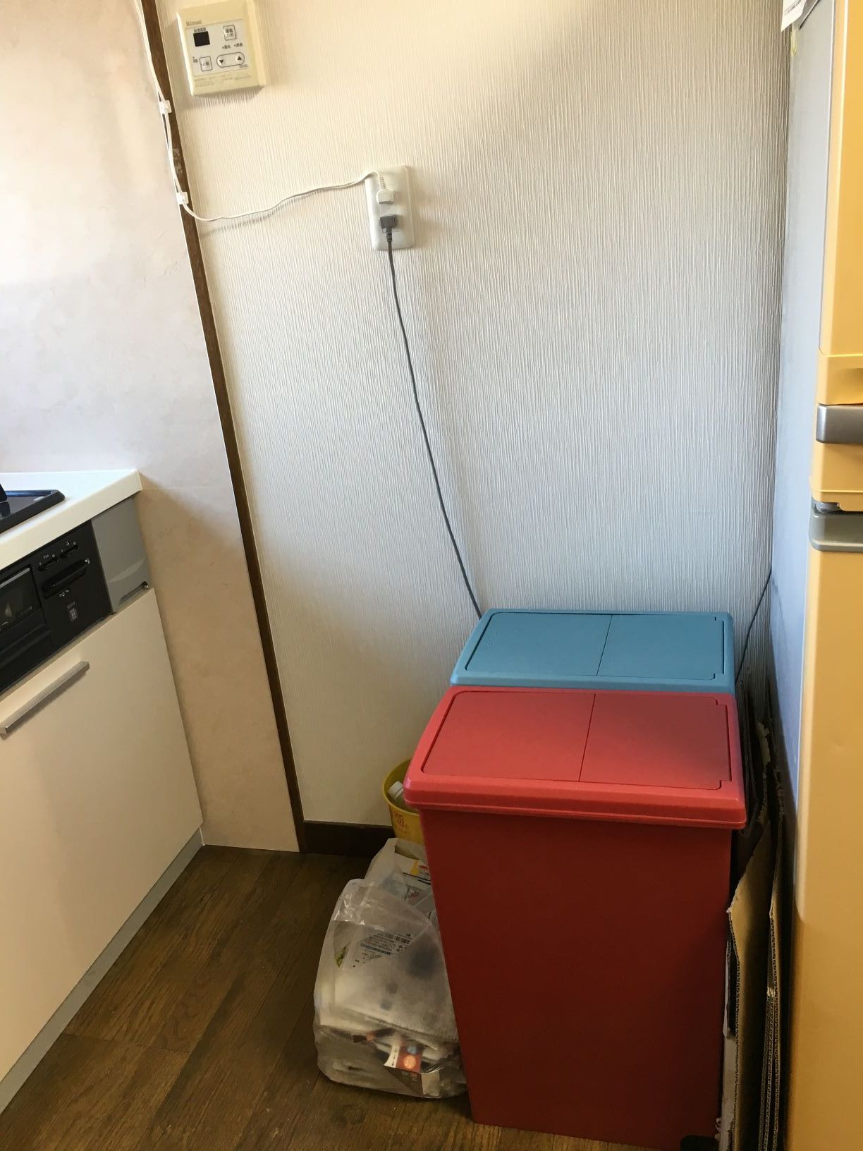 レンジの台とは反対側には冷蔵庫とゴミ箱があるので、こちらもキッチンで調理中にはとても便利な配置となりました。調理中に冷蔵庫の調味料を取り出したり、調理で出た野菜くずなどをすぐにゴミ箱に捨てることができます。