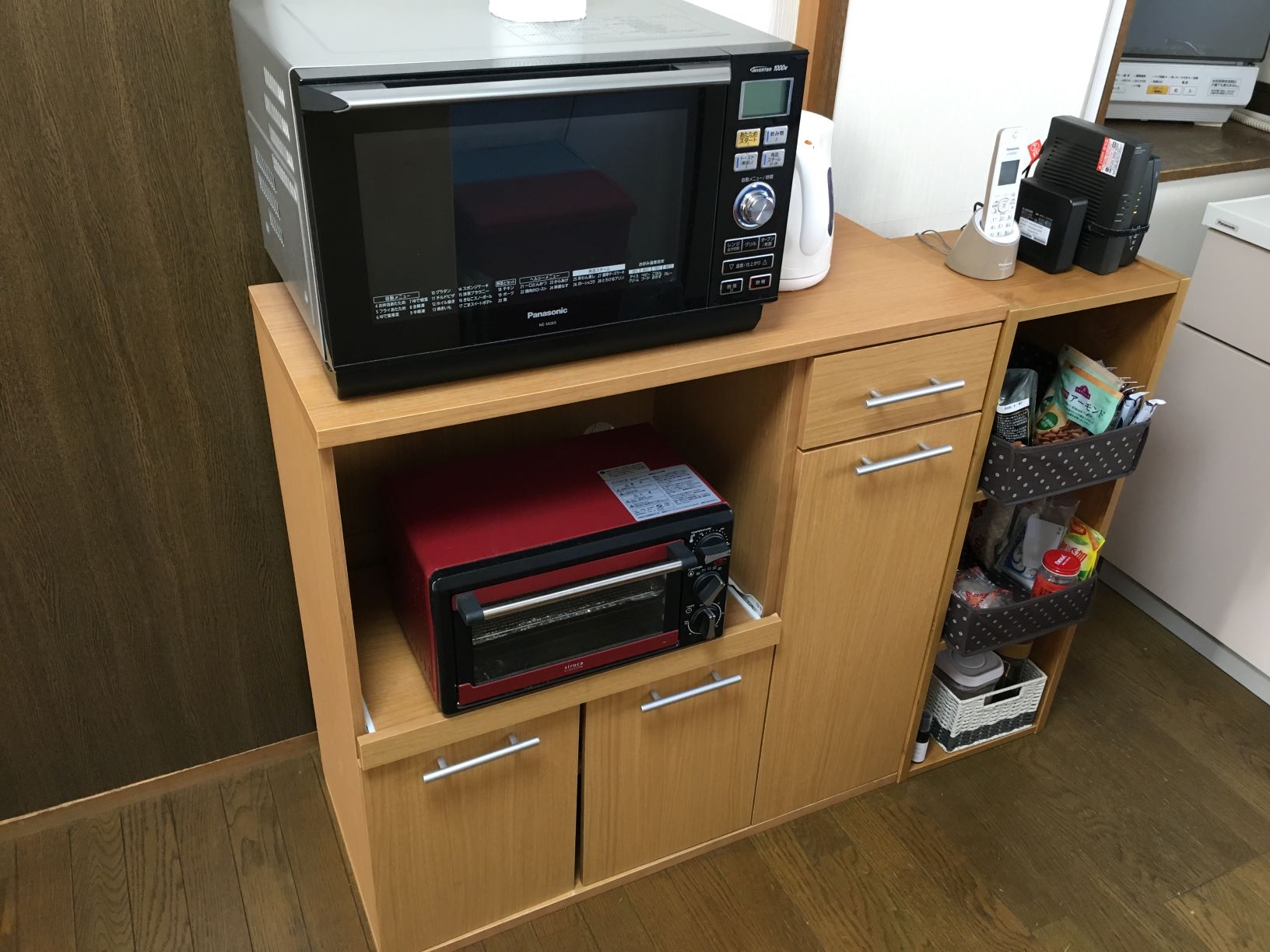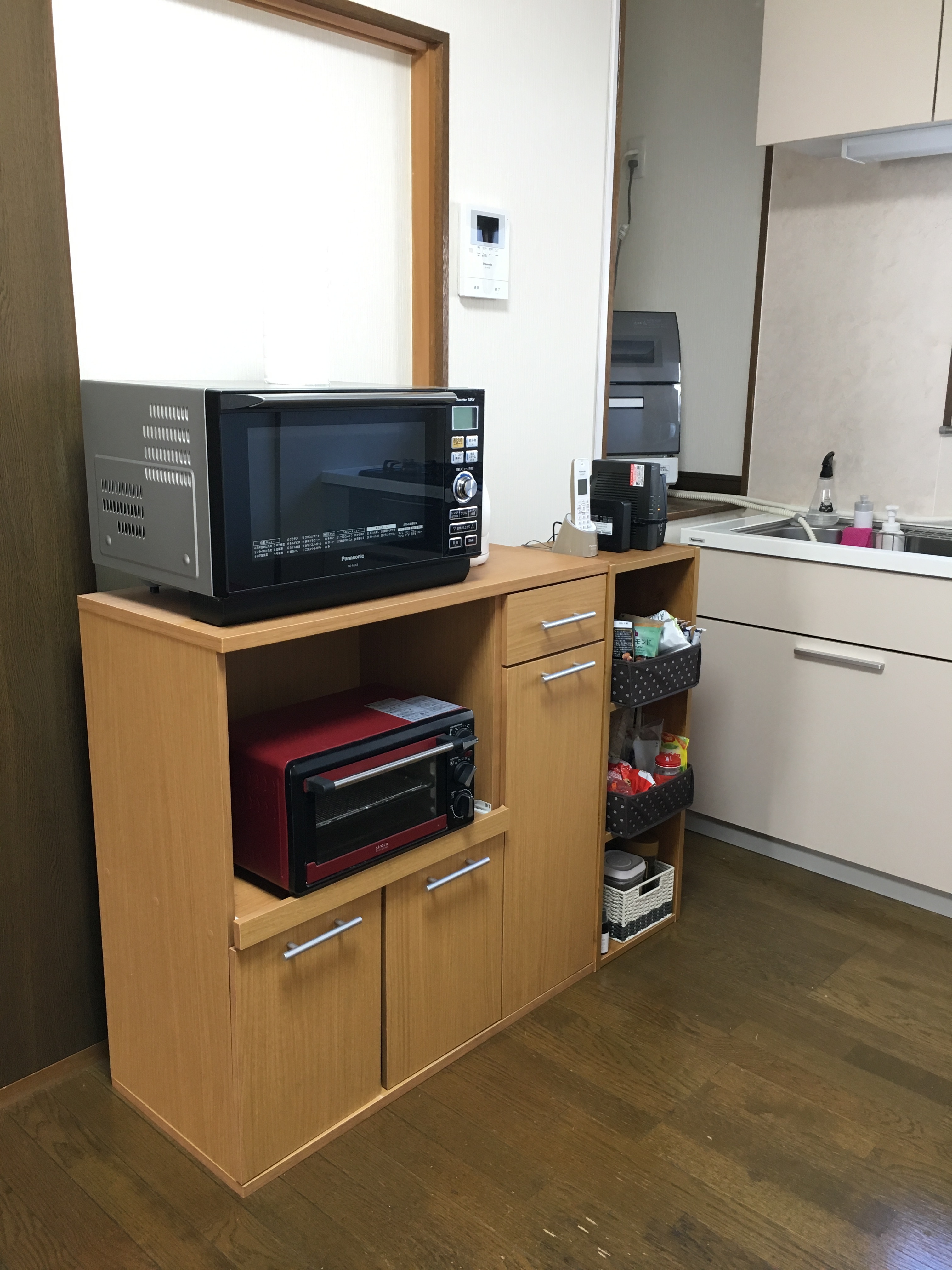 キッチンの調理台からレンジの棚が近くなったので、調理家電とガスコンロの連携もしやすくなりました。ガスコンロで調理中、オーブンレンジ・オーブントースター・湯沸かしポットが少し手を伸ばせば届く位置にあるので、以前よりもグッと便利になりました。